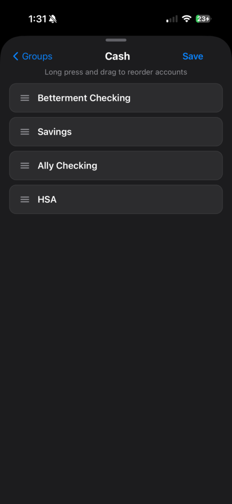 Just long press and drag to reorder accounts within a group. Whether you want your primary checking account at the top or prefer to group things differently, you’re in control.